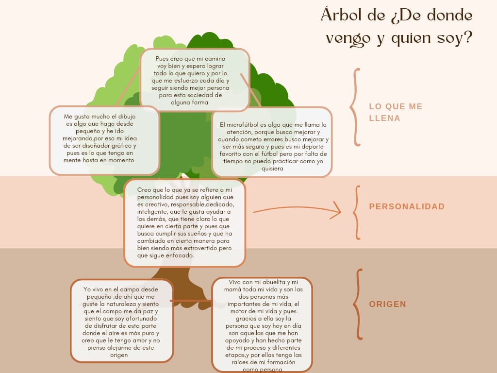 En esta parte reconozco en cierta parte de donde vengo, hablo del lugar donde crecí, hablo de las dos personas quienes me han apoyado y me han formado como persona y han hecho que sea la persona que soy en estos momentos ,son por las que siempre doy lo mejor de mi, muestro mi personalidad que es representada por el tronco que es una parte de la planta que se forma después de las raíces y le da sostenimiento a la planta y luego las ramas como mis gustos y aquello que me hace feliz.